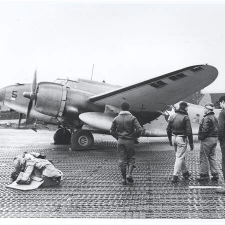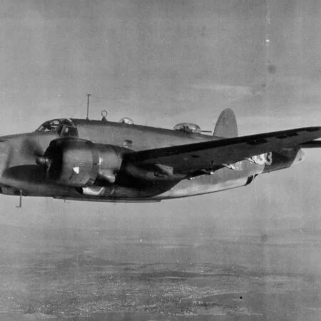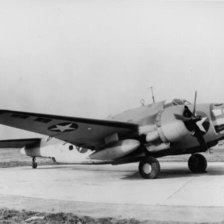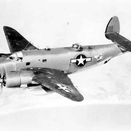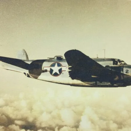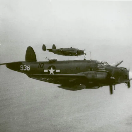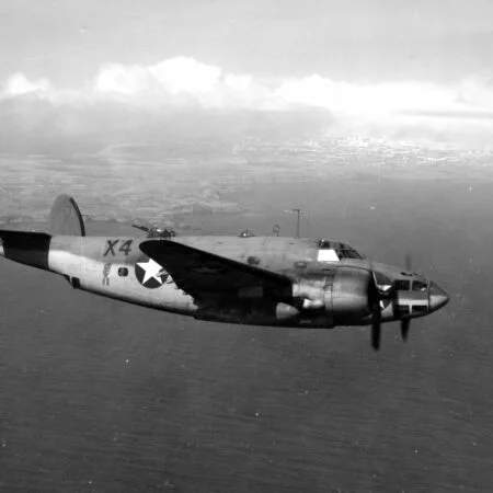 Specially equipped PV-1 BuNo 48919, VB-135, flown by Lt.(jg) Lewis “Pat” Patteson 14 June 1944. For this mission the plane was rigged with seven cameras, and a Photographer Mate was added to the crew. Also, tunnel twin .30 cal. machine guns were removed to accommodate three stationary aerial cameras F-56 in the back of the fuselage. Soon tunnel guns had been removed on the majority of Empire Express Venturas, due to their low efficiency, and in attempt to minimize take-off weight.