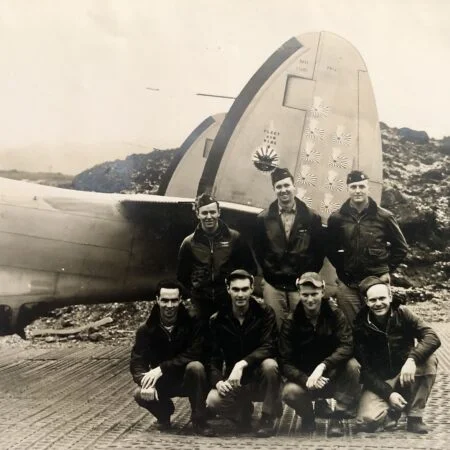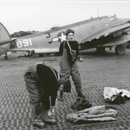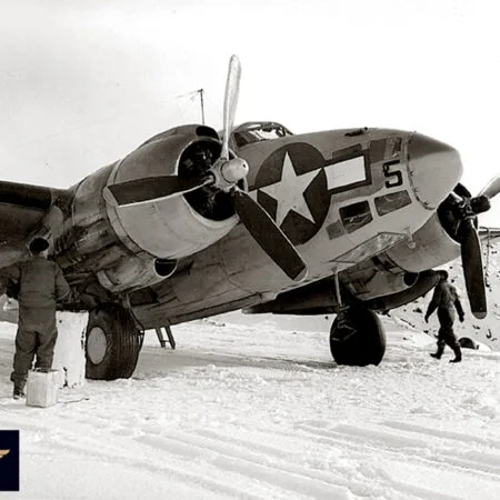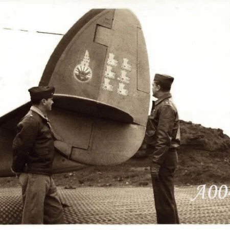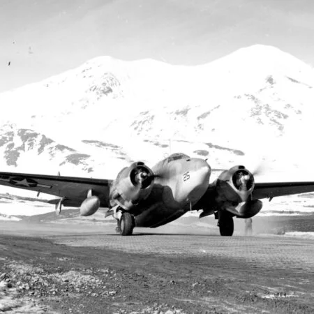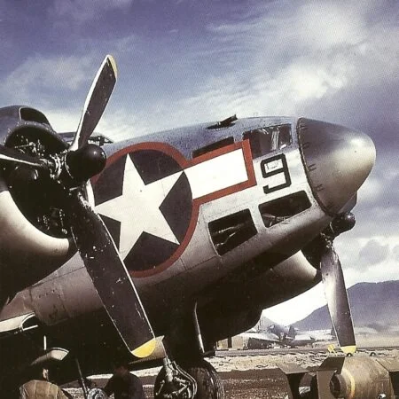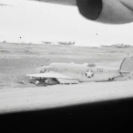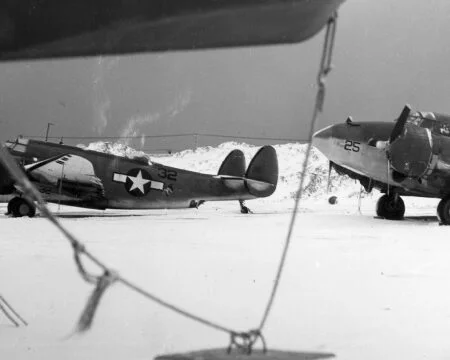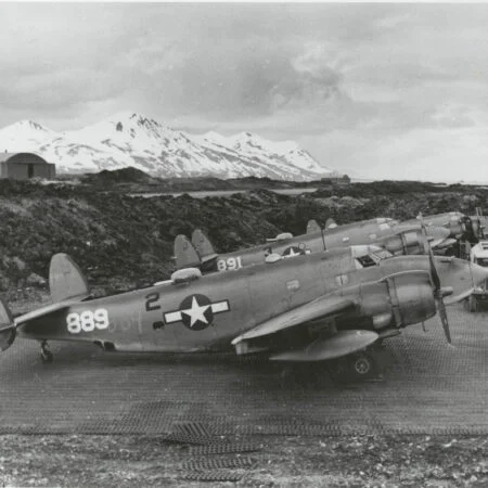 VB-135 20V (BuNo unknown) “Ventura” from the previous photo with “Star and Bars” National insignia, Amchitka, summer 1943. Note that the left “bar” partially overlaps the fuselage artwork.